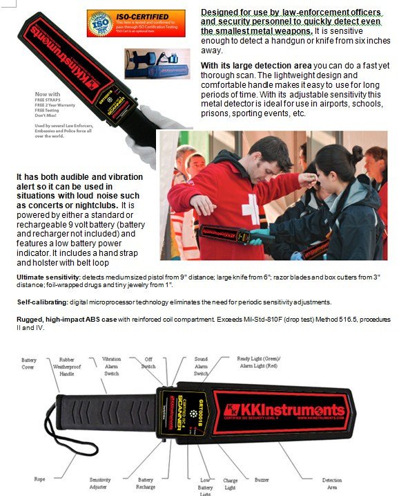 Designed for use by law-enforcement officers and security personnel to quickly detect even the smallest metal weapons. It is sensitive enough to detect a handgun or knife from six inches away.